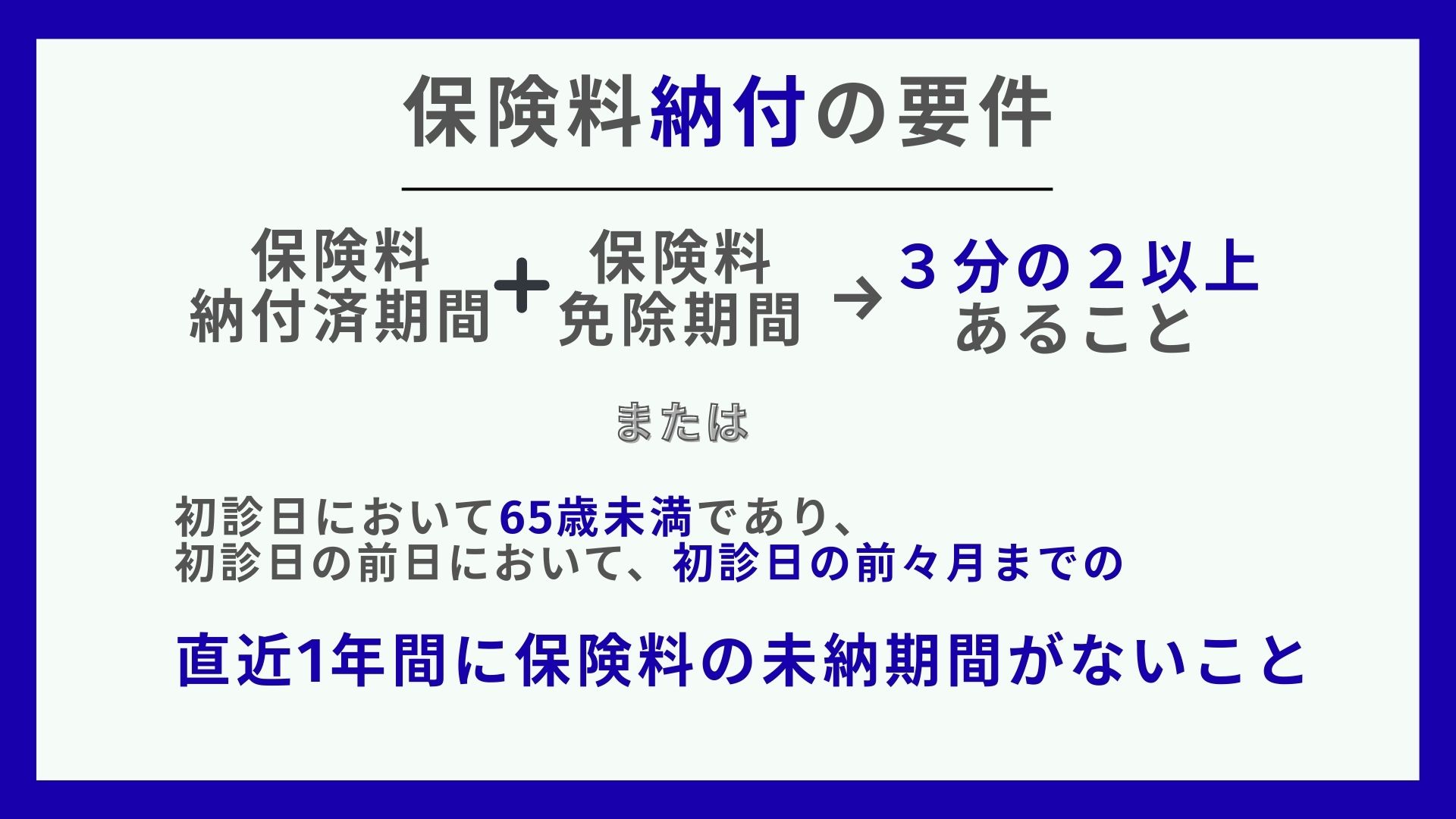 ①初診日のある月の前々月までの期間のうち、保険料納付済期間+免除期間が3分の2以上あること