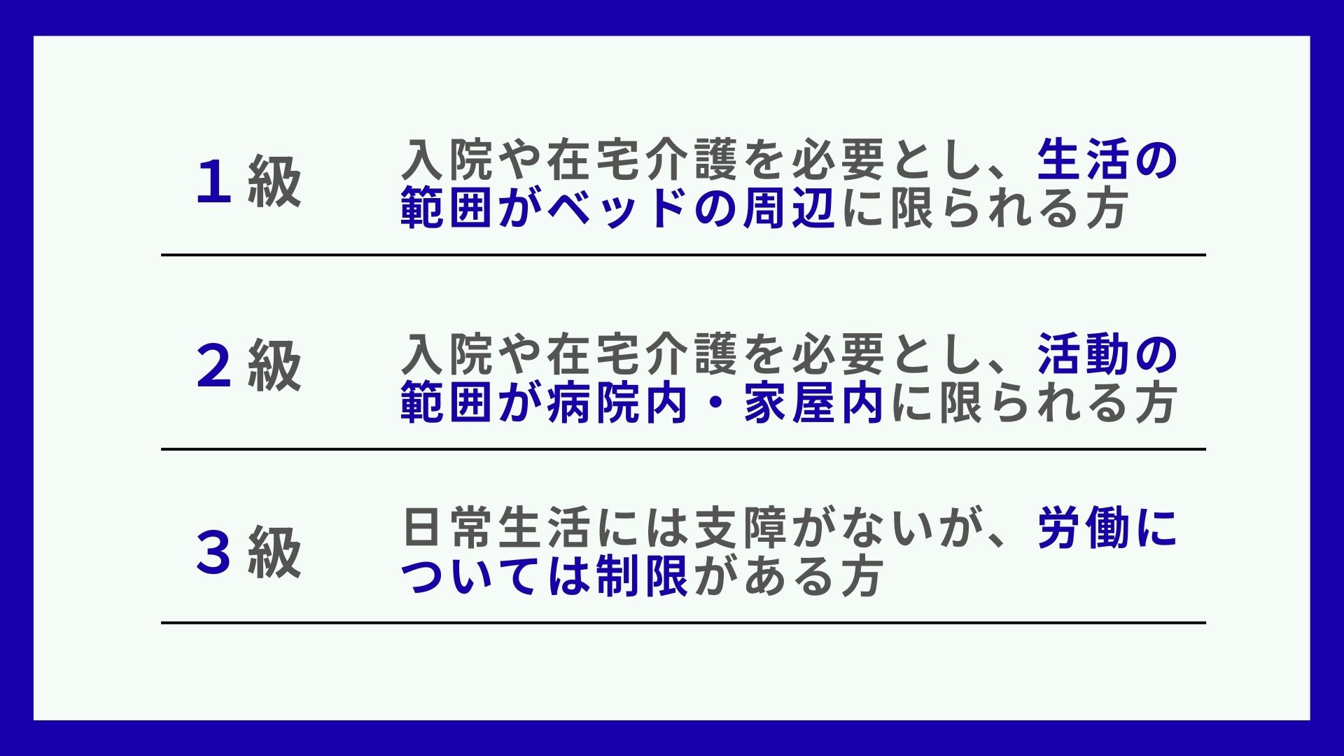 初診日から1年6か月経過した日(障害認定日)または20歳到達時点で、障害等級表に定める1級または2級(厚生年金の場合は1~3級)に該当していること。
