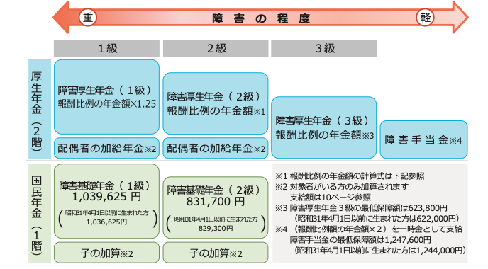 ※障害厚生年金1級と2級には、同じ等級の障害基礎年金も支給されます。